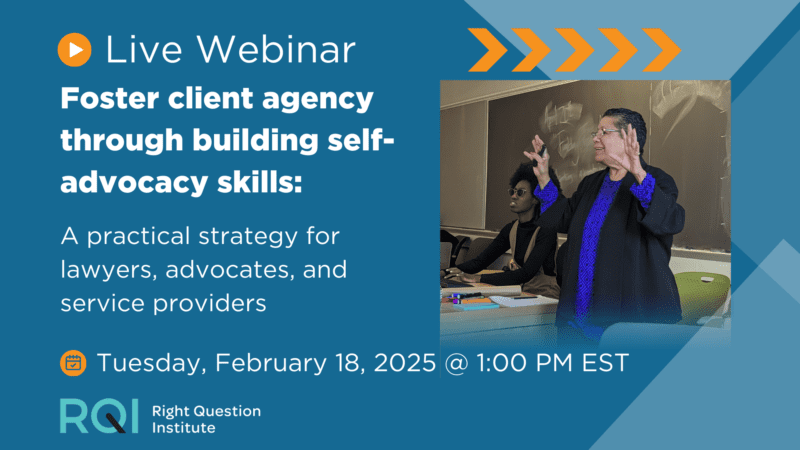 The Right Question Institute (RQI) specializes in designing simple educational methods and tools to teach skills essential for self-advocacy and agency. RQI helps people working on the front lines of a range of systems build the ability of their clients to: a) ask better questions, and b) participate more effectively in decisions that affect their lives and the lives of their families.