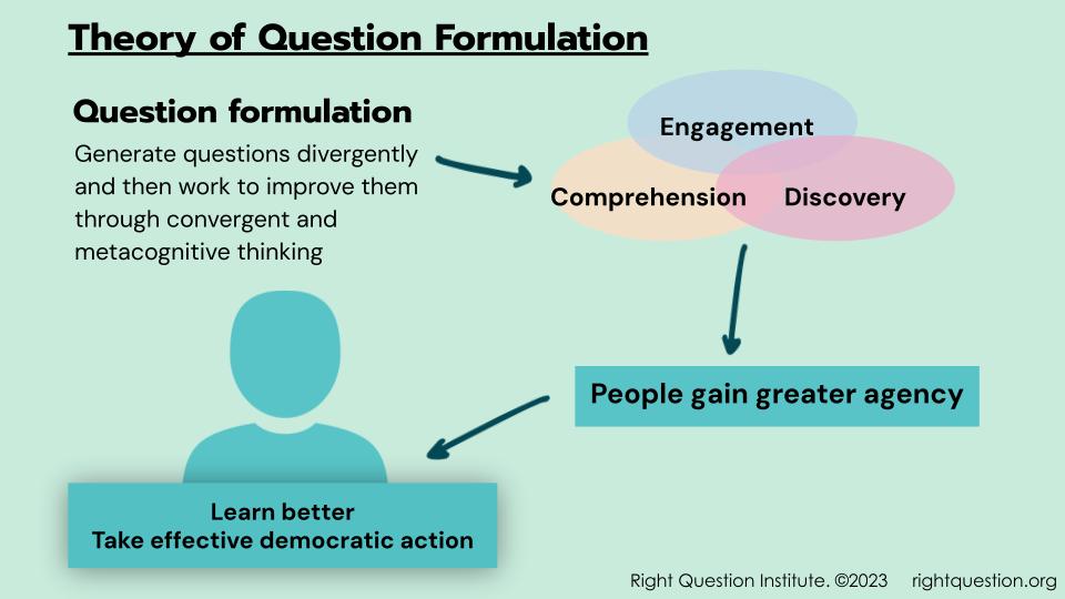 RQI has synthesized data and analysis from decades of work and multiple sources in order to develop a theory that explains what consistently happens when people formulate their own questions. Our Theory of Question Formulation for Learning shows how question formulation can lead to more motivated learners and nimble thinkers. Our Theory of Question Formulation for Democratic Action unpacks how question formulation can lead to motivated and savvy actors who take more effective democratic action.