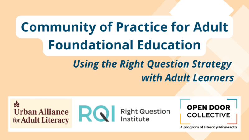 RQI, in collaboration with the Open Door Collective of Literacy MN and the Urban Alliance for Adult Literacy, is working to convene a network of adult educators to collaborate on a community of practice using the Right Question Strategy.