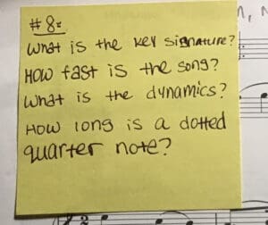 For the experienced instrumental students, during one-on-one and small group instrumental lessons, I also used the Question Formation Technique to guide students’ preparation in learning new music and sight reading. I use the technique with two goals in mind: