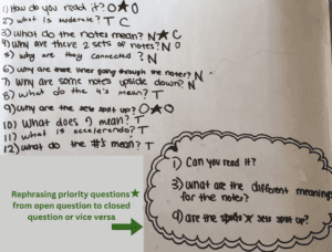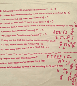 Note: Students first labeled their questions according to categorizations for the lesson: T= Music Terminology / Symbol, N= Music Notation, and O = Other. Then, they labeled with “O” for “open question” and “C” for “closed question.”