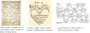 - Examples of music notational graphics were shown: a Gregorian chant from the Middle Ages; late medieval “eye music” called “Belle, Bonne, Sage;” and a contemporary minimalist composition called “Observing Squirrels,” by Jason Freeman. This was alongside a discussion on how navigating sounds through each of these music notational systems related to using a map or GPS.